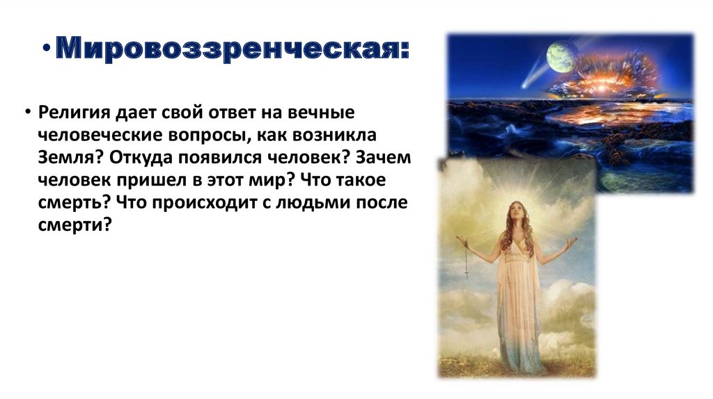 • Мировоззренческая:• Религия дает свой ответ на вечные