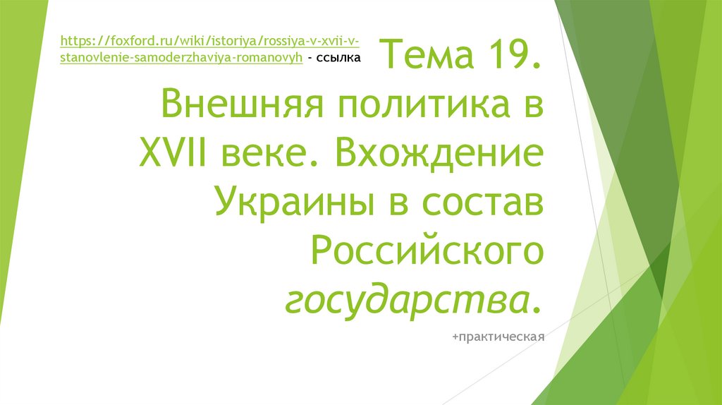 Внешняя политика в XVII веке. Вхождение Украины в состав Российского государства. Тема 19