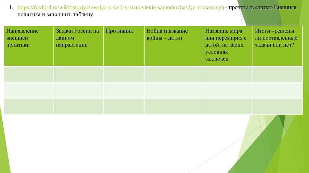 1. https://foxford.ru/wiki/istoriya/rossiya-v-xvii-v-stanovlenie-samoderzhaviya-romanovyh - прочитать статью Внешняяполитика и заполнить таблицу.