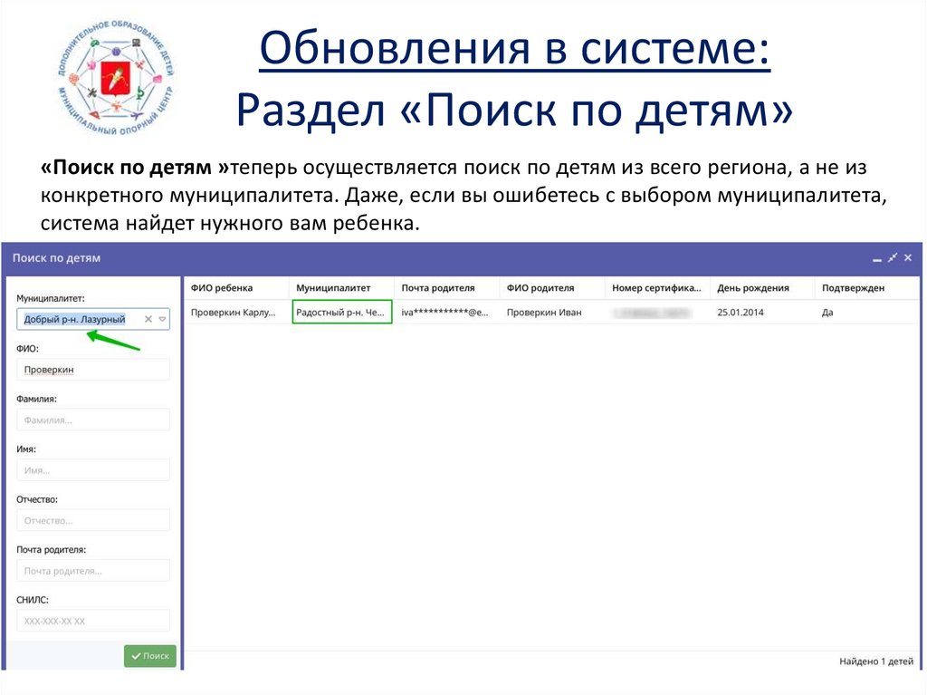 Обновления в системе:Раздел «Поиск по детям»