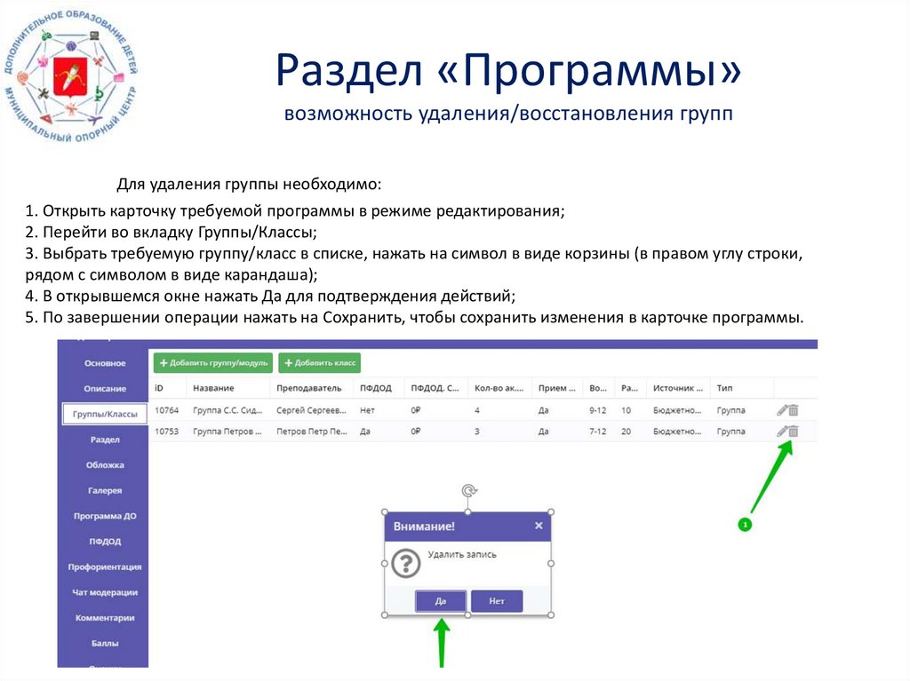 Раздел «Программы»возможность удаления/восстановления групп