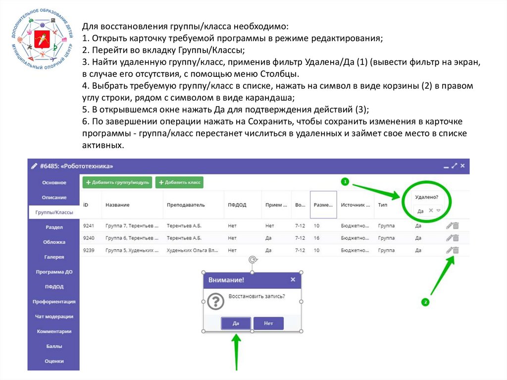 Для восстановления группы/класса необходимо:1. Открыть карточку требуемой программы в режиме редактирования;