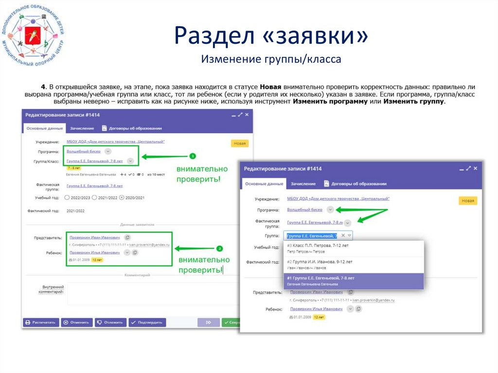 Раздел «заявки»Изменение группы/класса