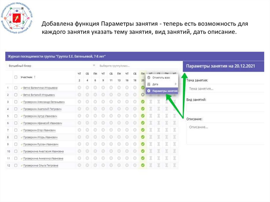 Добавлена функция Параметры занятия - теперь есть возможность длякаждого занятия указать тему занятия, вид занятий, дать описание.