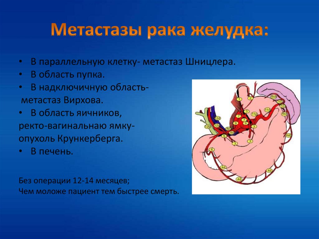 • В параллельную клетку- метастаз Шницлера.• В область пупка.