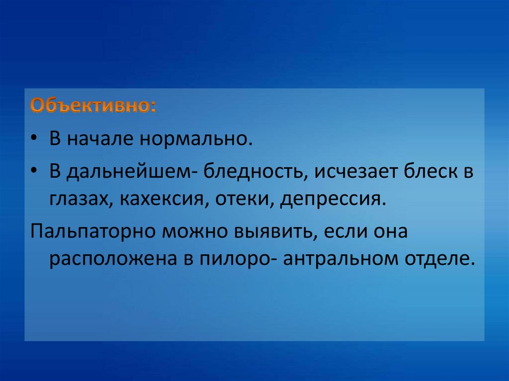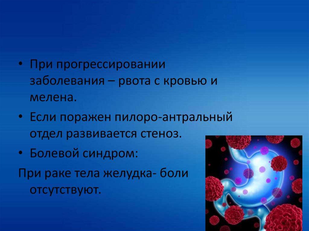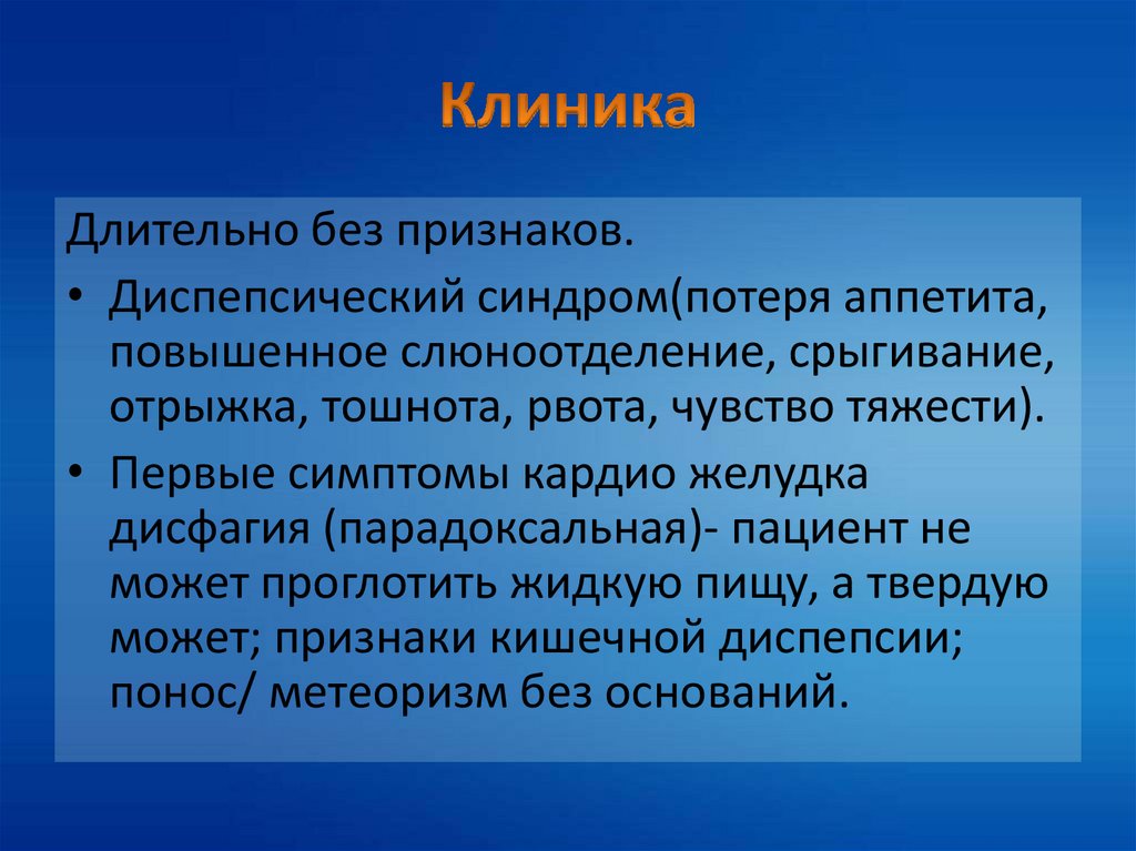 Длительно без признаков.• Диспепсический синдром(потеря аппетита,