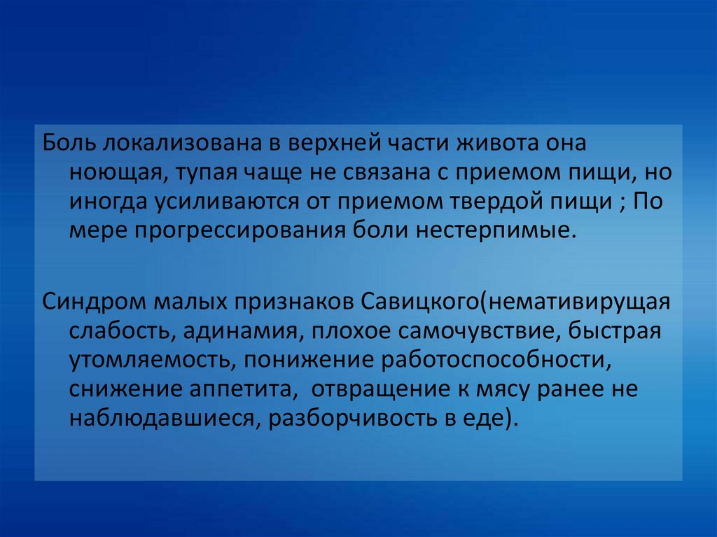 Боль локализована в верхней части живота онаноющая, тупая чаще не связана с приемом пищи, но
