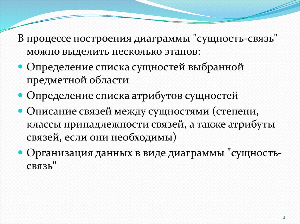 В процессе построения диаграммы "сущность-связь"можно выделить несколько этапов:
