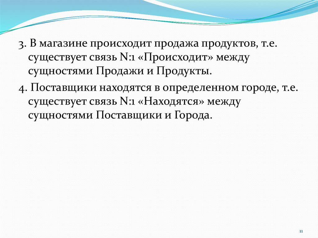 3. В магазине происходит продажа продуктов, т.е.существует связь N:1 «Происходит» между