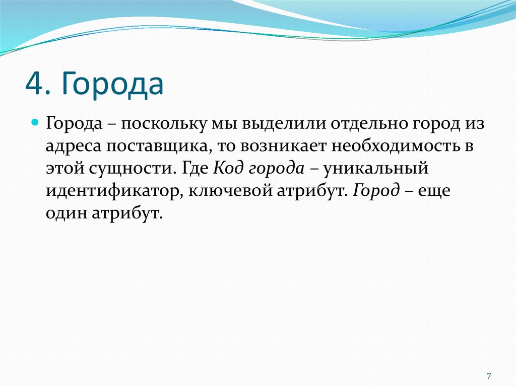 4. ГородаГорода – поскольку мы выделили отдельно город из