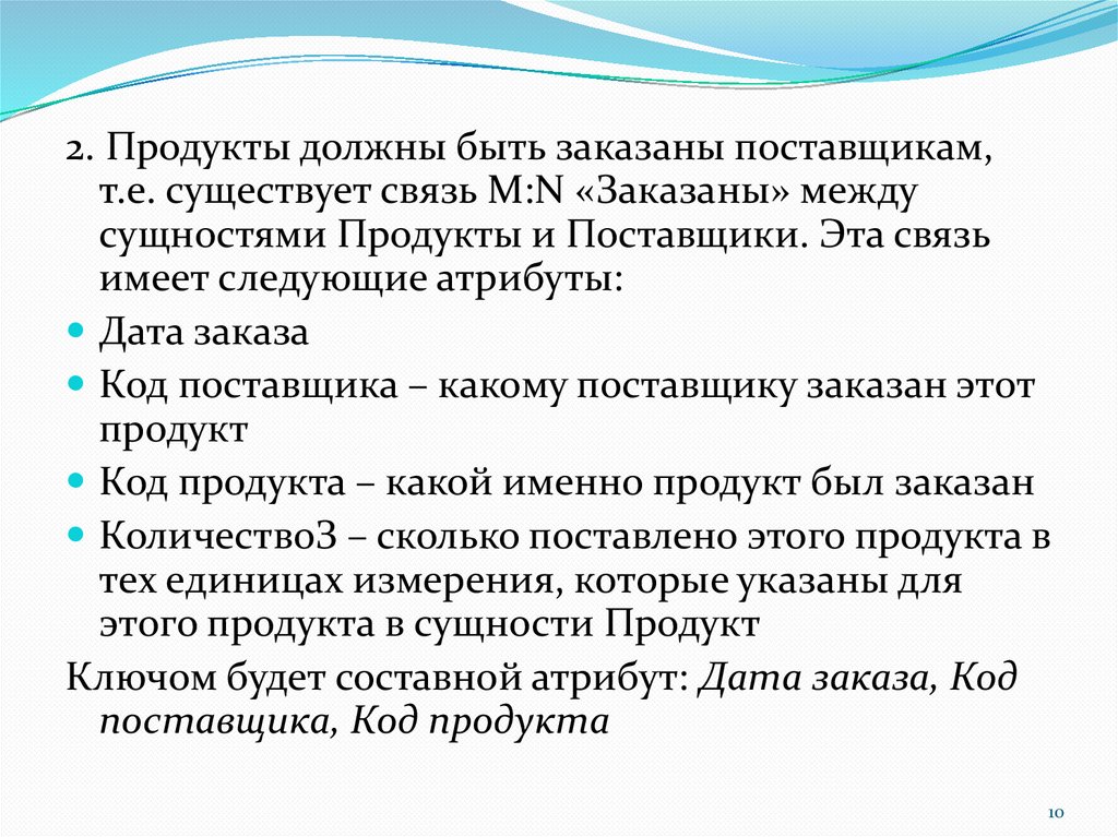 2. Продукты должны быть заказаны поставщикам,т.е. существует связь M:N «Заказаны» между