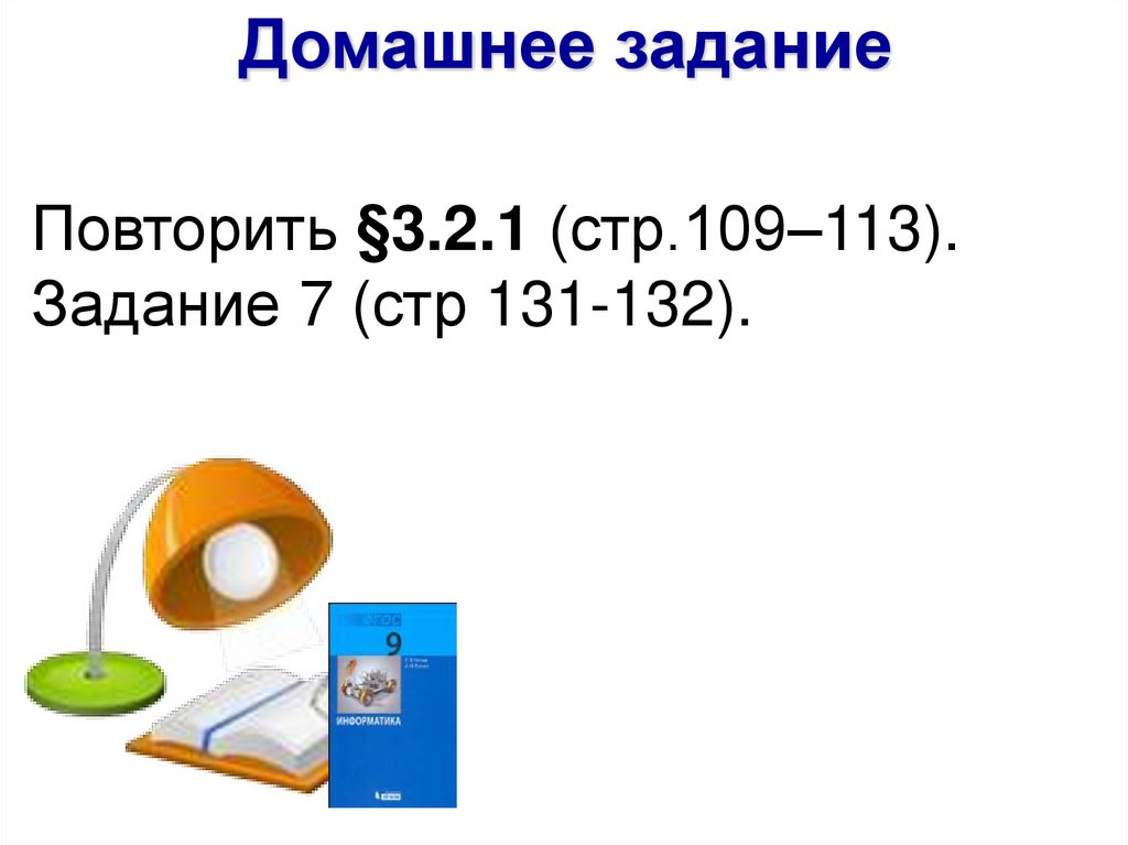 Домашнее заданиеПовторить §3.2.1 (стр.109–113).