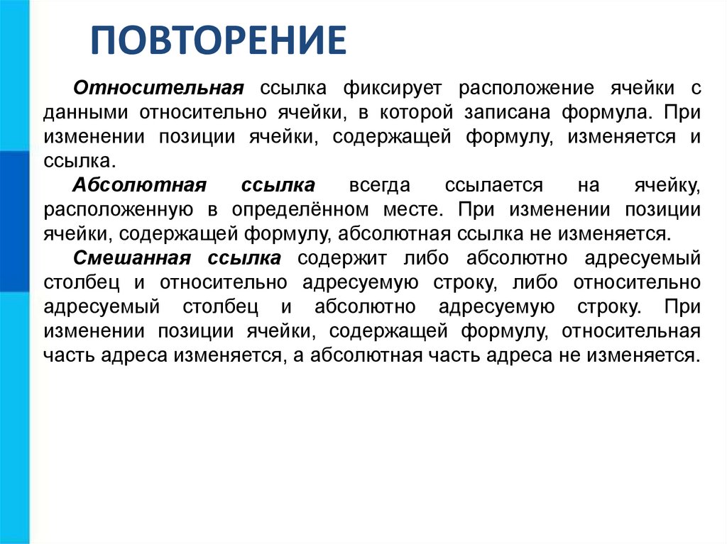 ПОВТОРЕНИЕОтносительная ссылка фиксирует расположение ячейки с