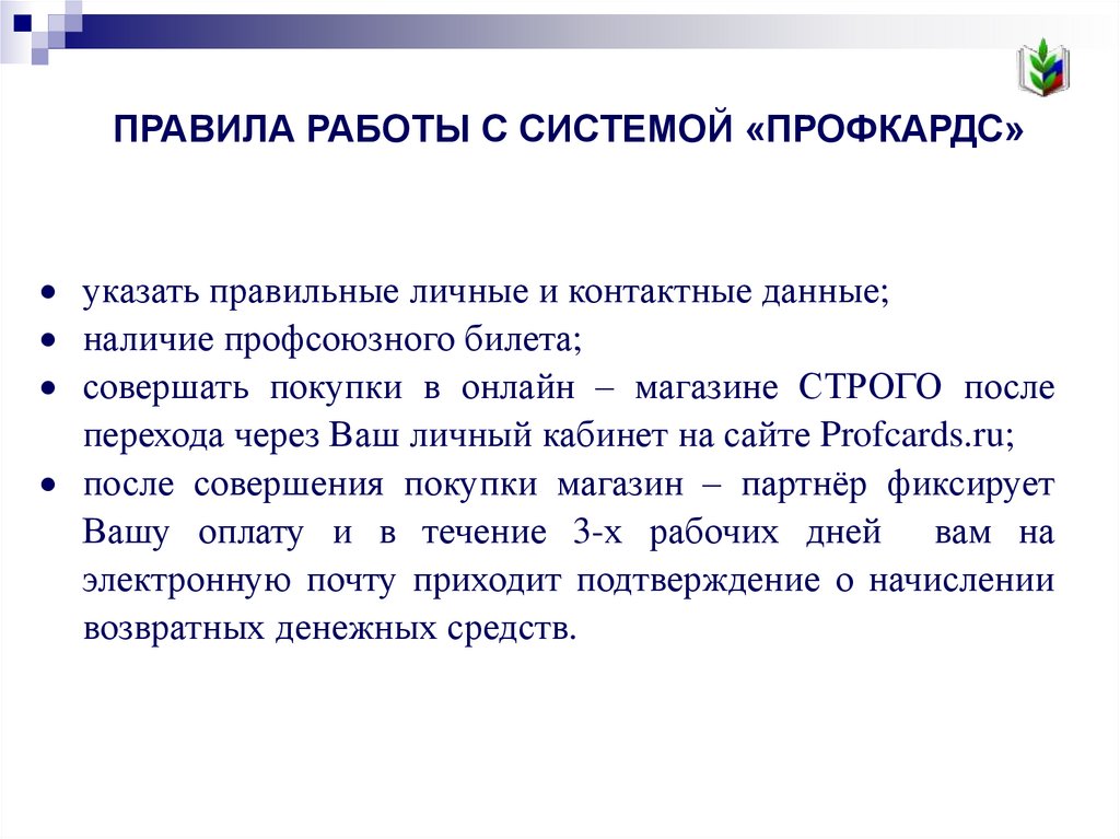 ПРАВИЛА РАБОТЫ С СИСТЕМОЙ «ПРОФКАРДС»указать правильные личные и контактные данные;