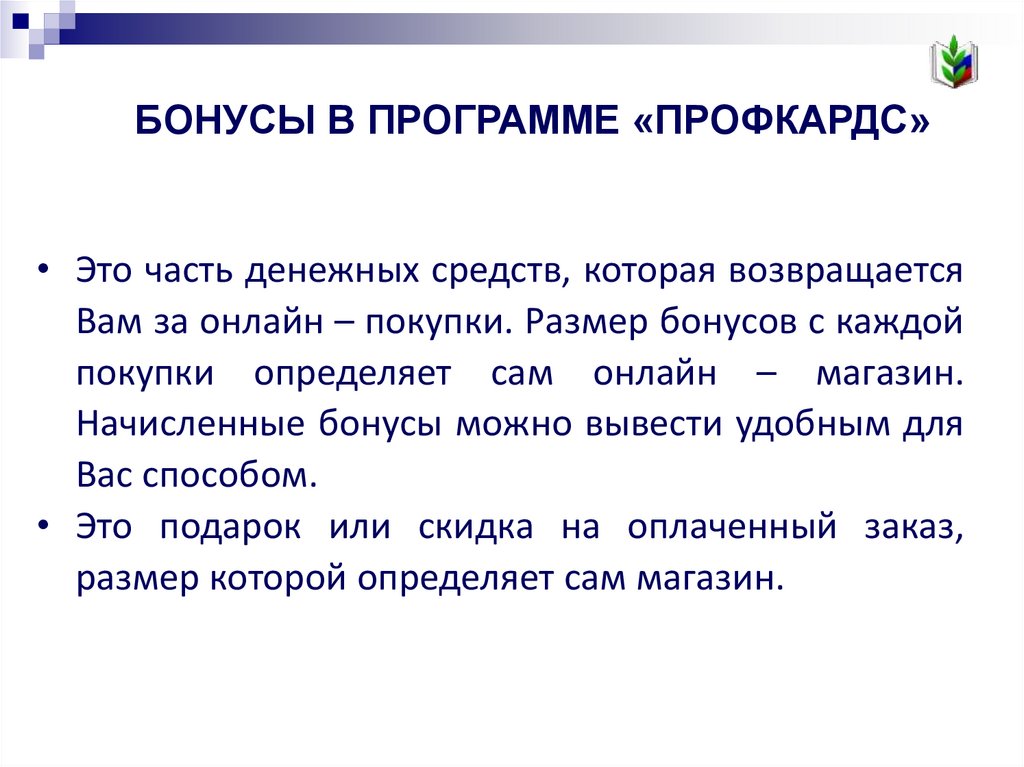 БОНУСЫ В ПРОГРАММЕ «ПРОФКАРДС»• Это часть денежных средств, которая возвращается