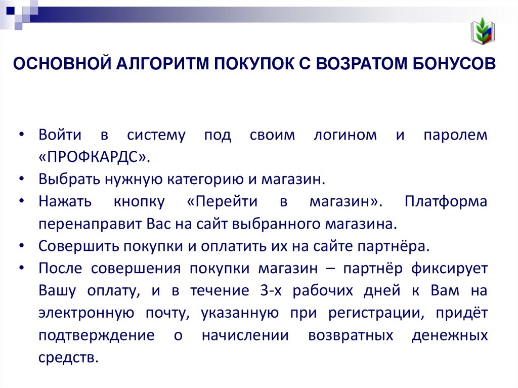ОСНОВНОЙ АЛГОРИТМ ПОКУПОК С ВОЗРАТОМ БОНУСОВ• Войти в систему под своим логином и паролем