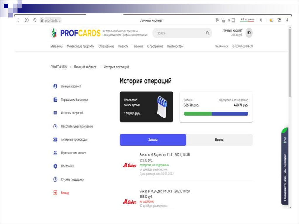 перехода через Ваш личный кабинет на сайте Profcards.ru;