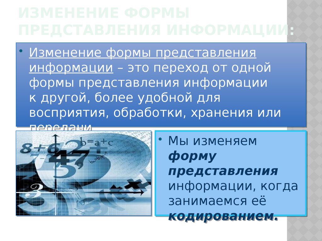 ИЗМЕНЕНИЕ ФОРМЫПРЕДСТАВЛЕНИЯ ИНФОРМАЦИИ: