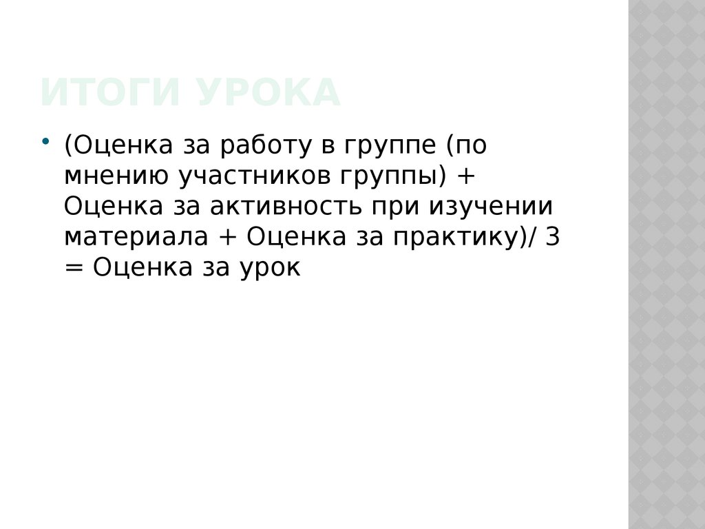 ИТОГИ УРОКА(Оценка за работу в группе (по