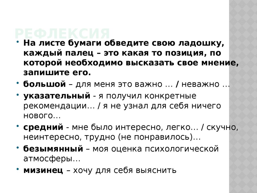 РЕФЛЕКСИЯНа листе бумаги обведите свою ладошку,