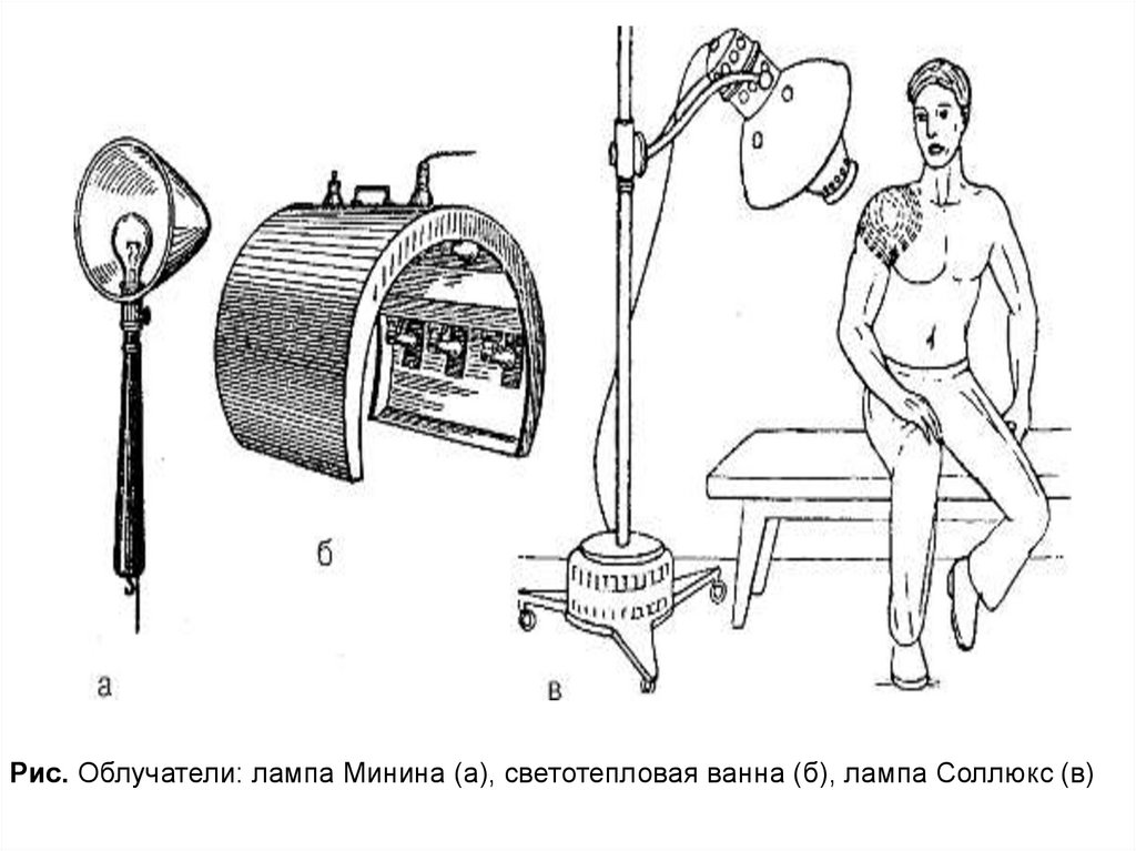 Рис. Облучатели: лампа Минина (а), светотепловая ванна (б), лампа Соллюкс (в)48.