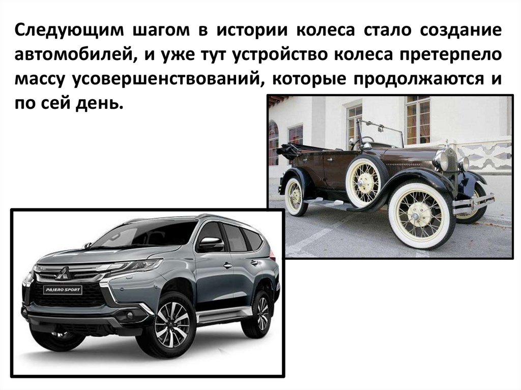 Следующим шагом в истории колеса стало созданиеавтомобилей, и уже тут устройство колеса претерпело