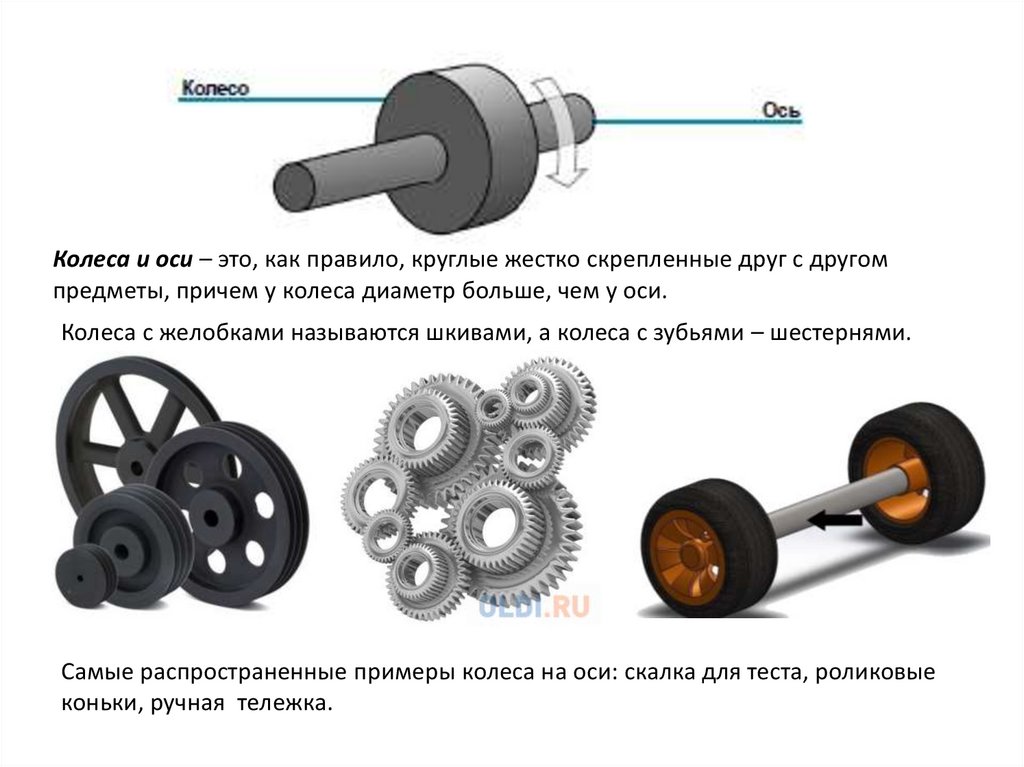 Колеса и оси – это, как правило, круглые жестко скрепленные друг с другомпредметы, причем у колеса диаметр больше, чем у оси.