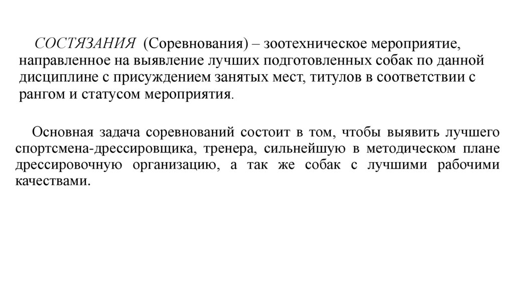 СОСТЯЗАНИЯ (Соревнования) – зоотехническое мероприятие,направленное на выявление лучших подготовленных собак по данной