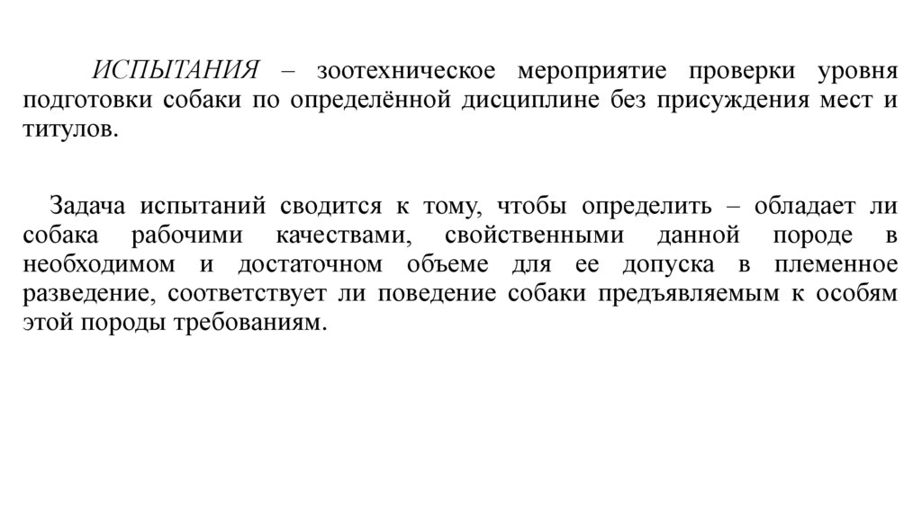 ИСПЫТАНИЯ – зоотехническое мероприятие проверки уровняподготовки собаки по определённой дисциплине без присуждения мест и