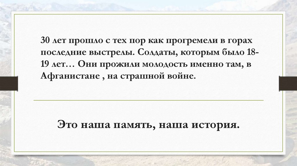 30 лет прошло с тех пор как прогремели в горахпоследние выстрелы. Солдаты, которым было 1819 лет… Они прожили молодость именно там, в