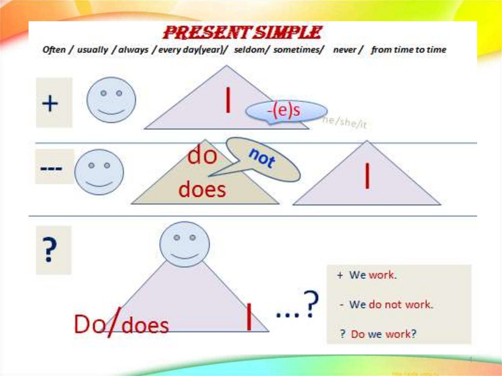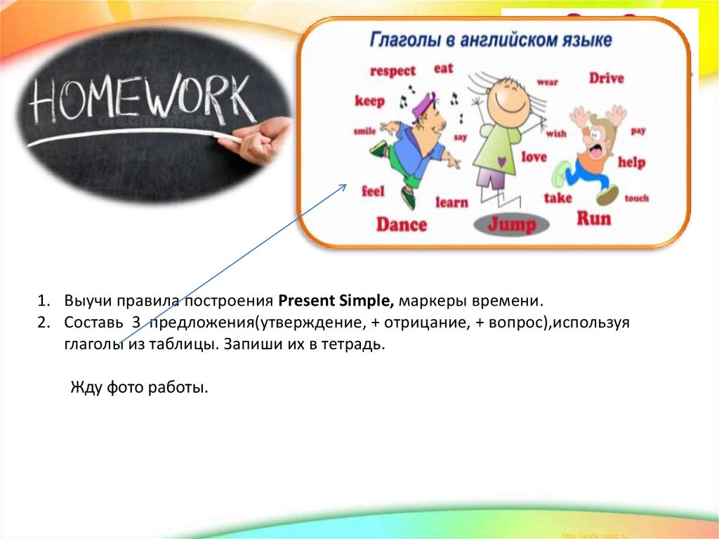 1. Выучи правила построения Present Simple, маркеры времени.2. Составь 3 предложения(утверждение, + отрицание, + вопрос),используя