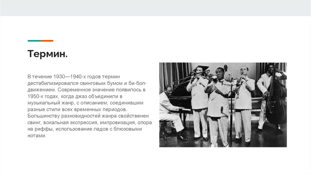 дестабилизировался свинговым бумом и би-бопдвижением. Современное значение появилось в