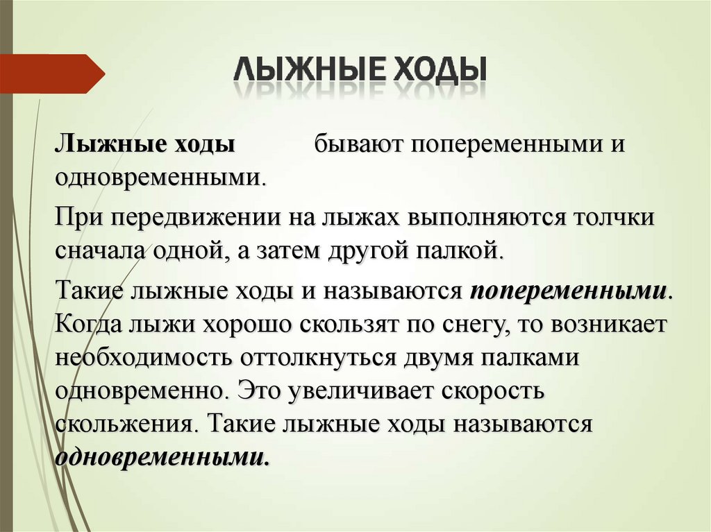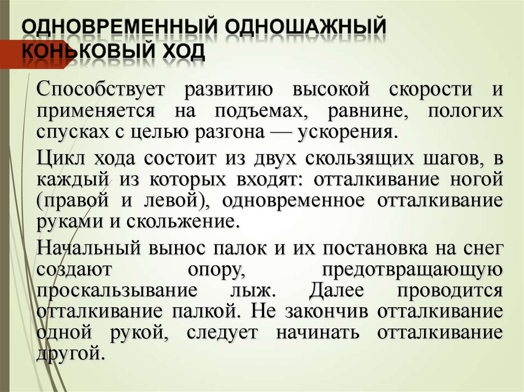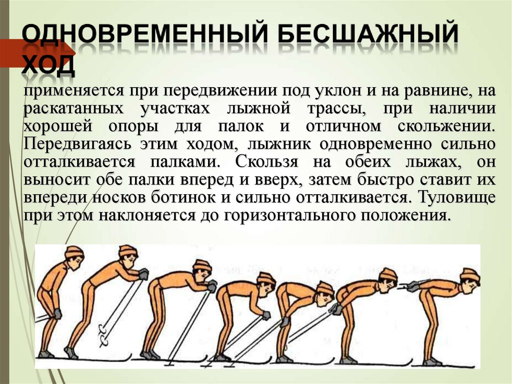 применяется при передвижении под уклон и на равнине, нараскатанных участках лыжной трассы, при наличии