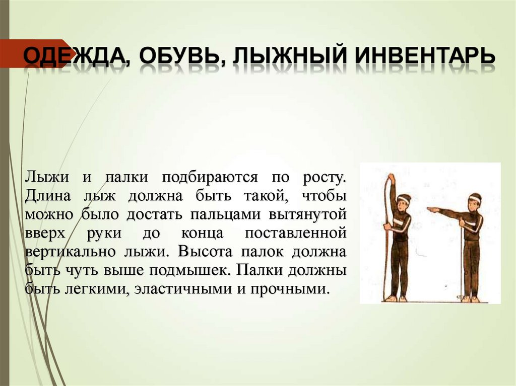Лыжи и палки подбираются по росту.Длина лыж должна быть такой, чтобы