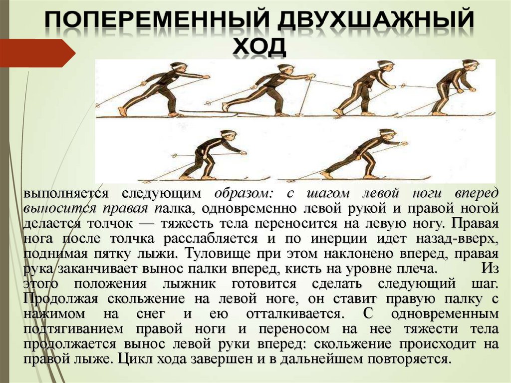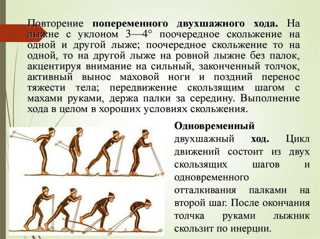 Повторение попеременного двухшажного хода. Налыжне с уклоном 3—4° поочередное скольжение на