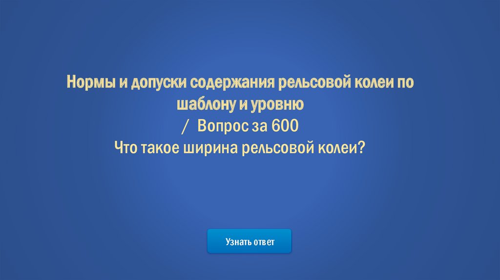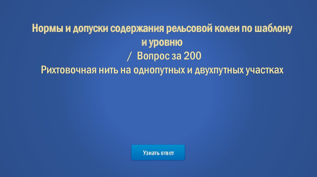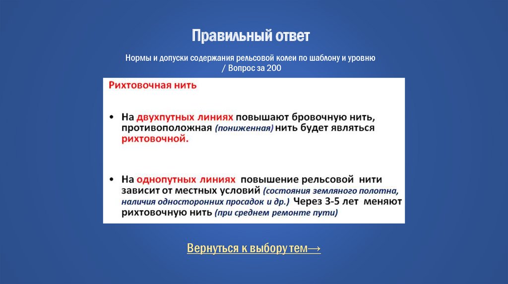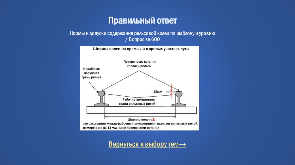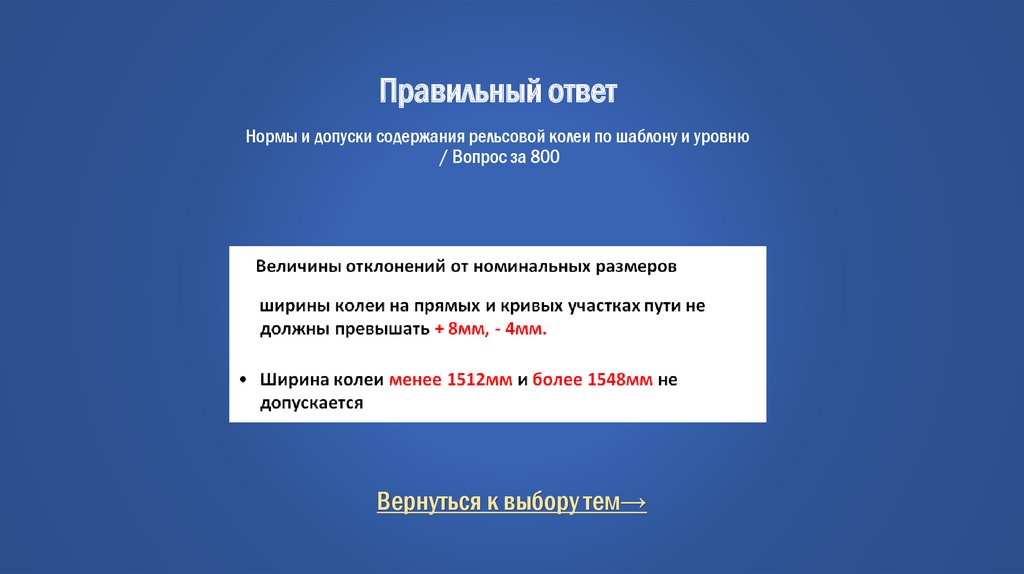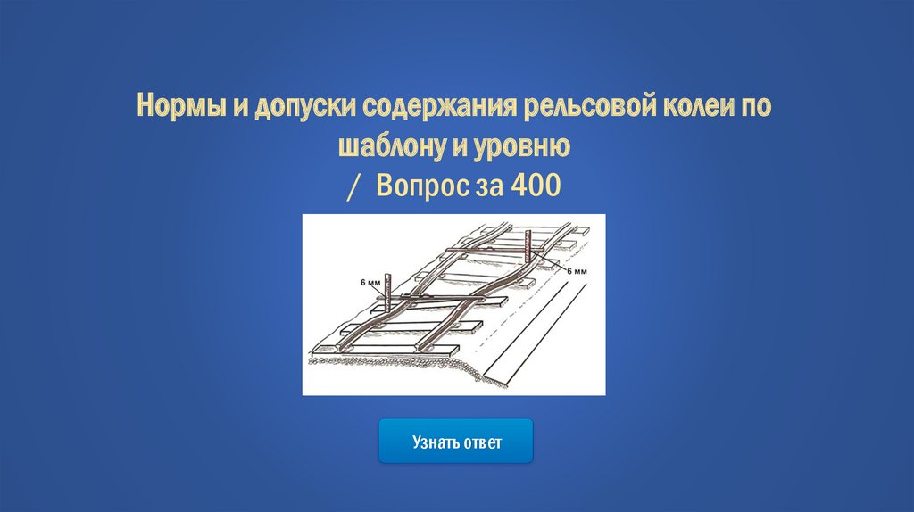 Правильный ответНормы и допуски содержания рельсовой колеи по шаблону и уровню