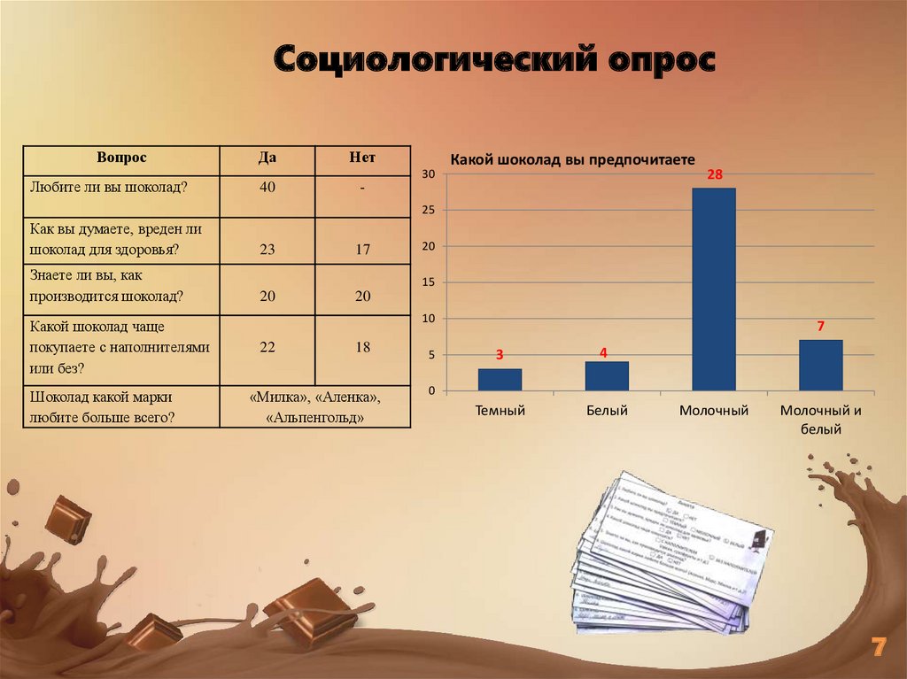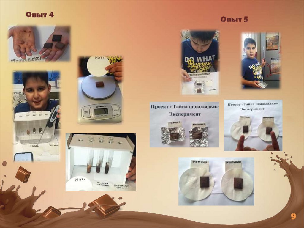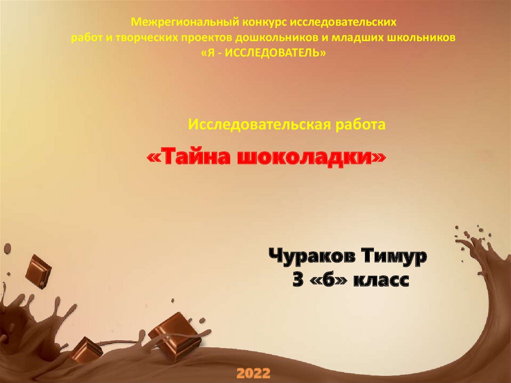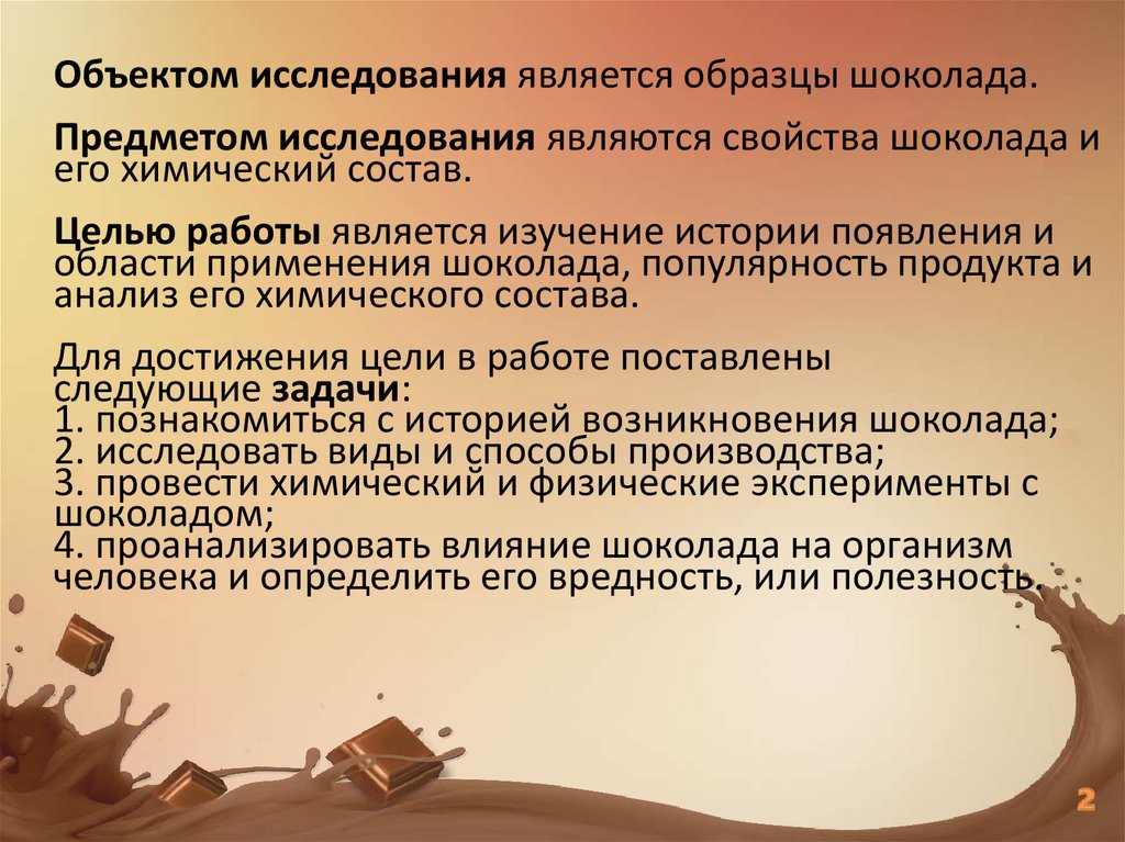 Объектом исследования является образцы шоколада.Предметом исследования являются свойства шоколада и