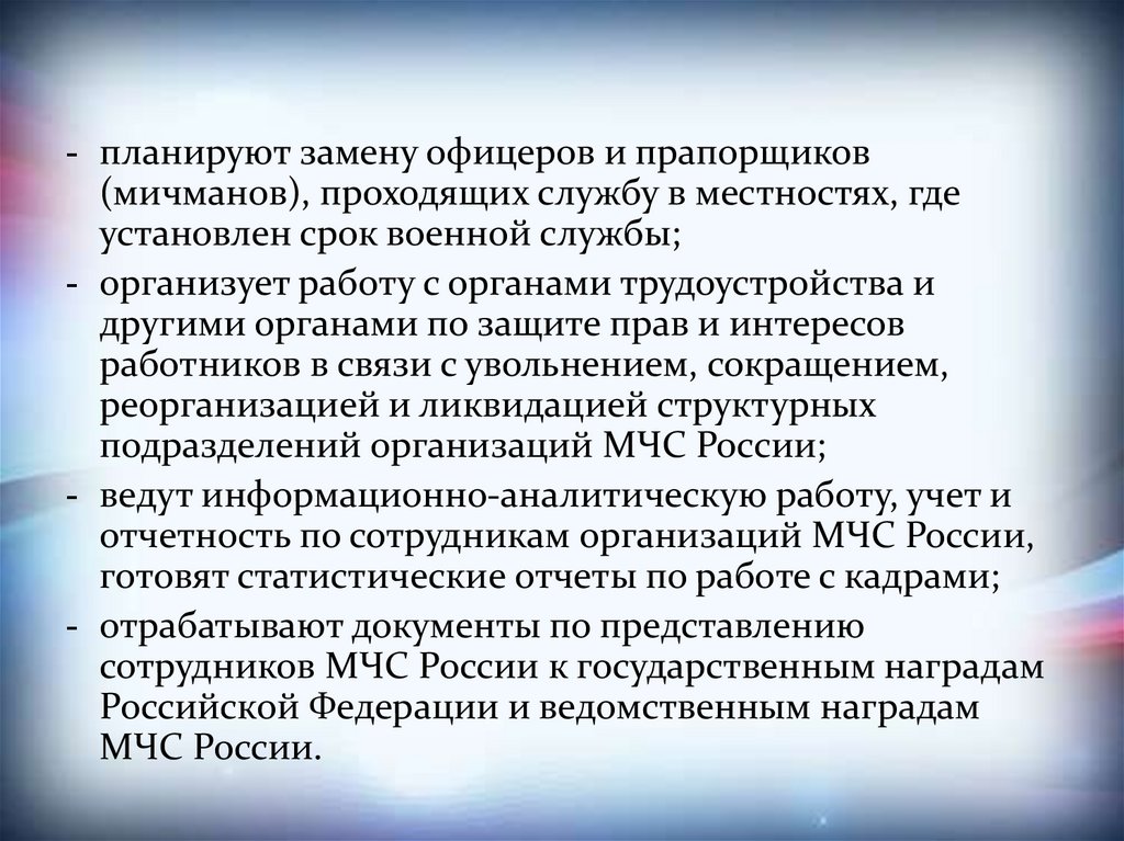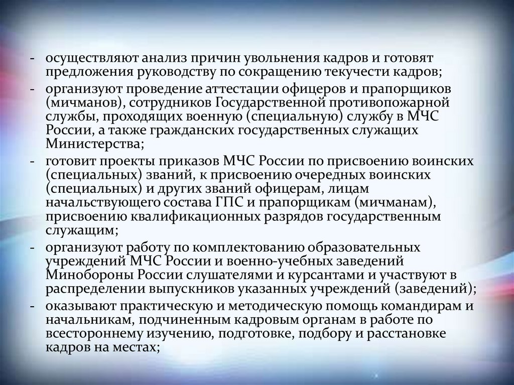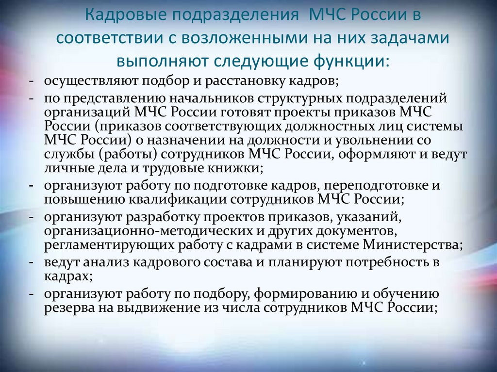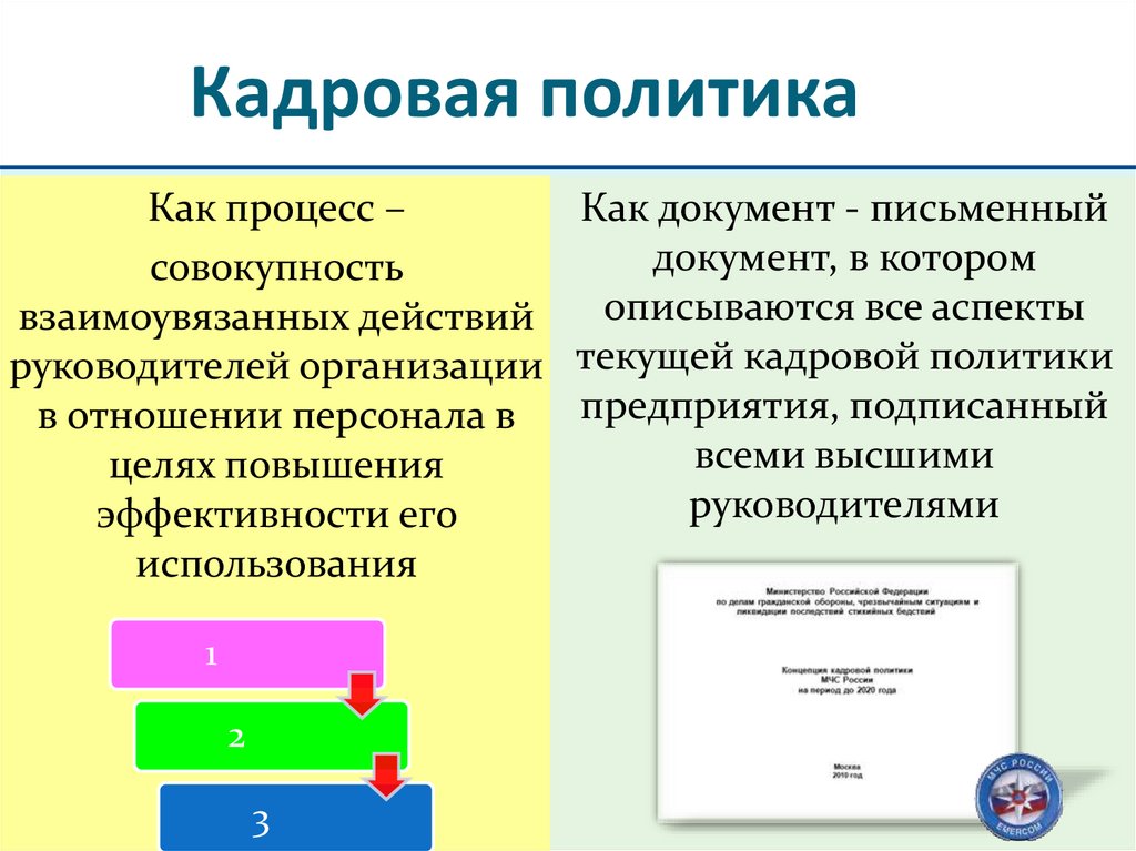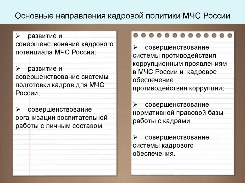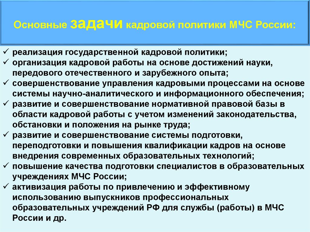 Основные задачи кадровой политики МЧС России:реализация государственной кадровой политики;