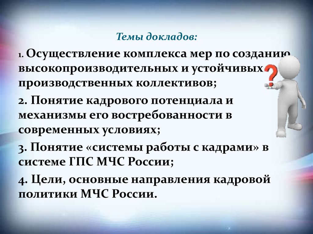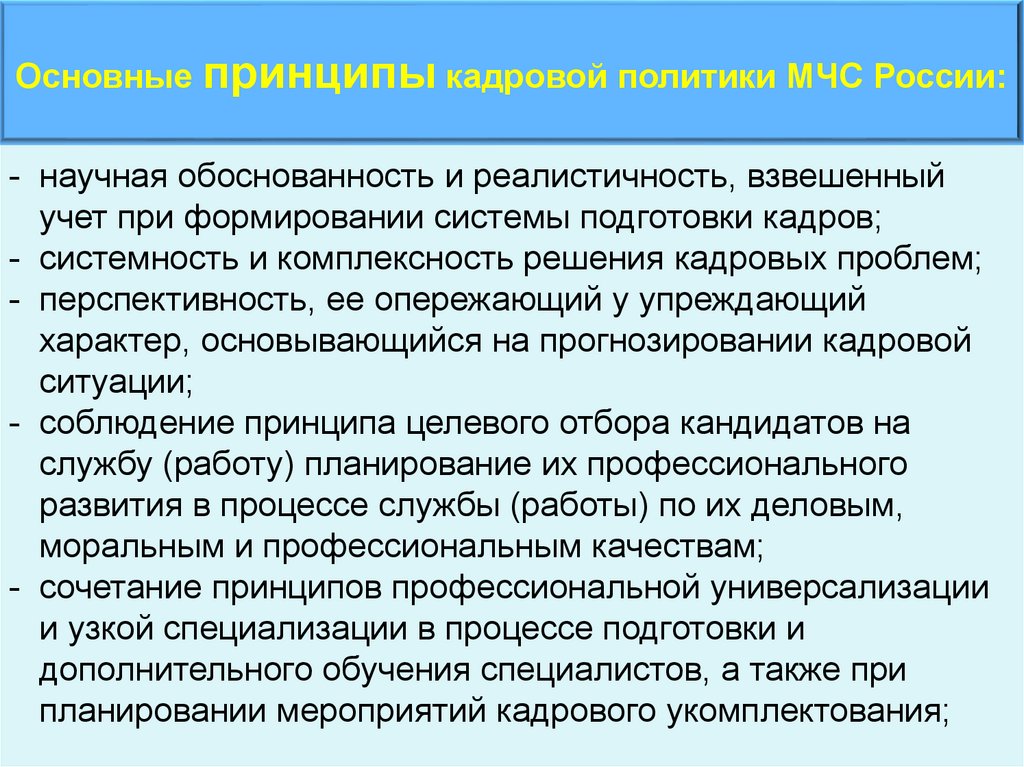 Основные принципы кадровой политики МЧС России:- научная обоснованность и реалистичность, взвешенный