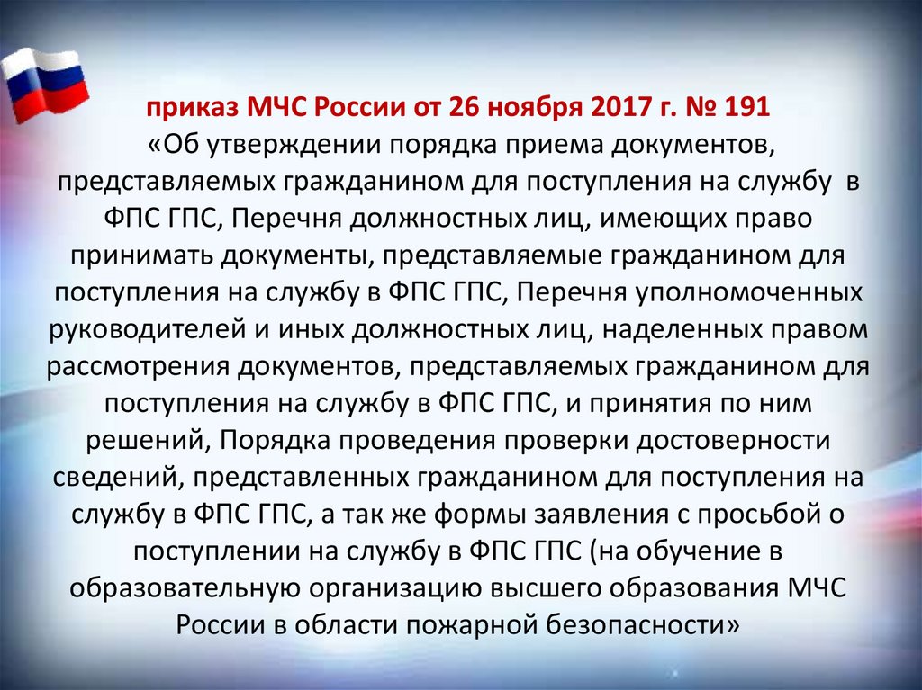 приказ МЧС России от 26 ноября 2017 г. № 191«Об утверждении порядка приема документов,