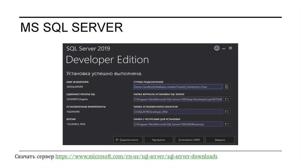 MS SQL SERVERСкачать сервер https://www.microsoft.com/en-us/sql-server/sql-server-downloads