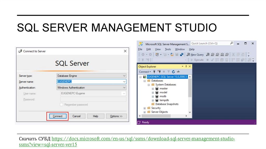 SQL SERVER MANAGEMENT STUDIOСкачать СУБД https://docs.microsoft.com/en-us/sql/ssms/download-sql-server-management-studiossms?view=sql-server-ver15