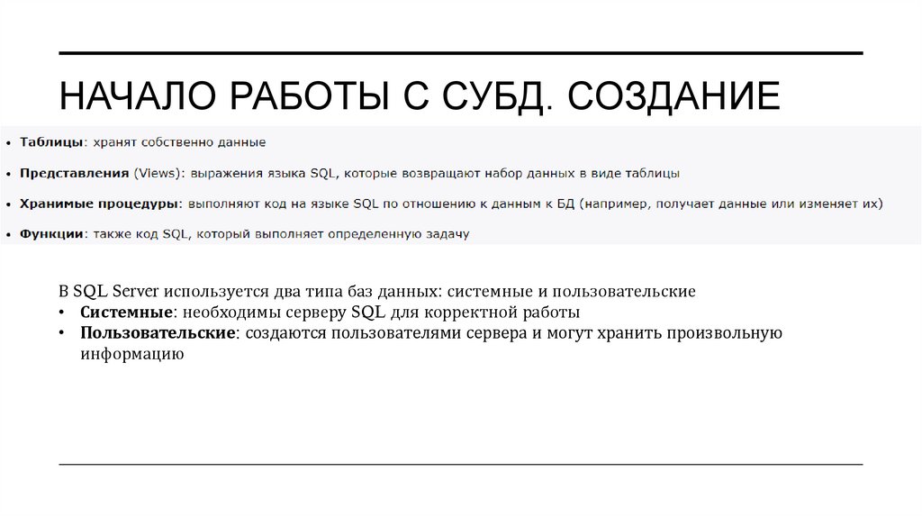 В SQL Server используется два типа баз данных: системные и пользовательские