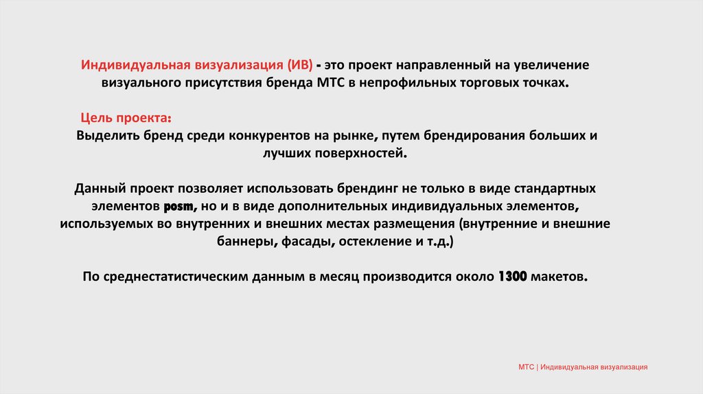Индивидуальная визуализация (ИВ) - это проект направленный на увеличениевизуального присутствия бренда МТС в непрофильных торговых точках.