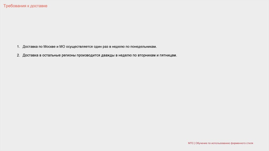 1. Доставка по Москве и МО осуществляется один раз в неделю по понедельникам.2. Доставка в остальные регионы производится дважды в неделю по вторникам и пятницам.