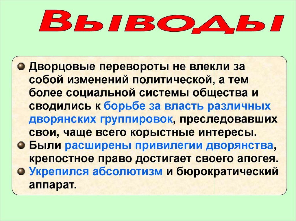 Дворцовые перевороты не влекли засобой изменений политической, а тем
