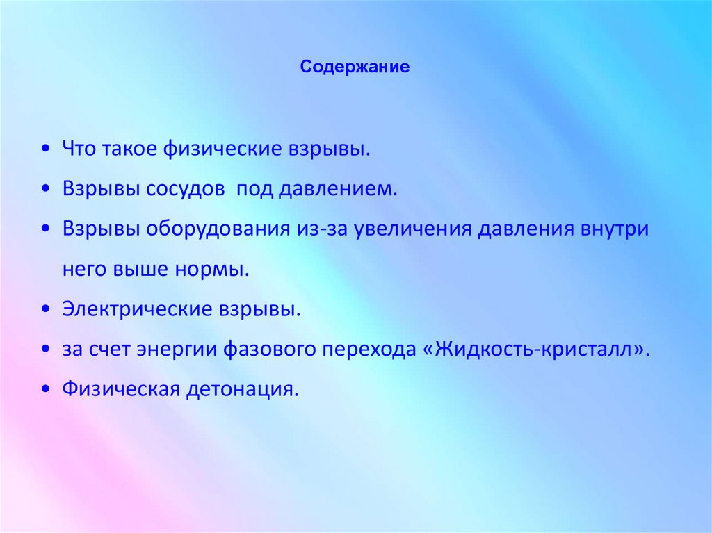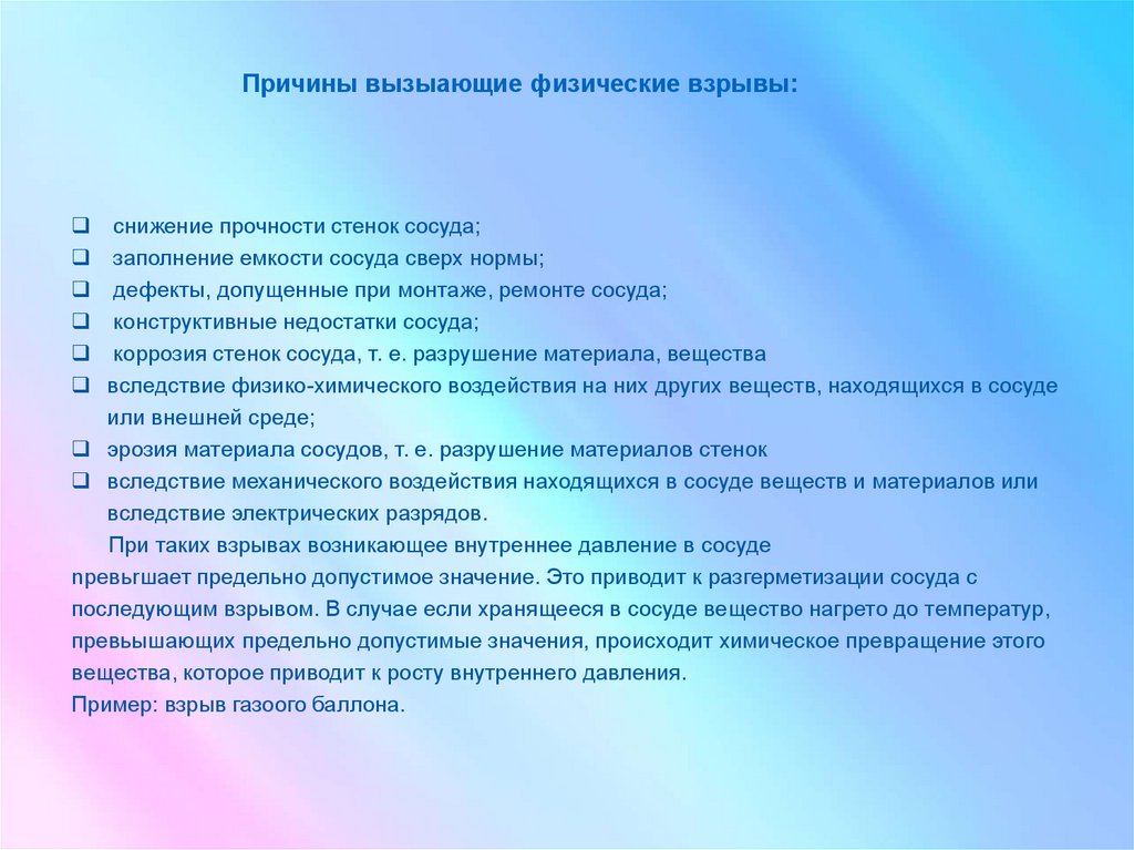 Причины вызыающие физические взрывы:снижение прочности стенок сосуда;