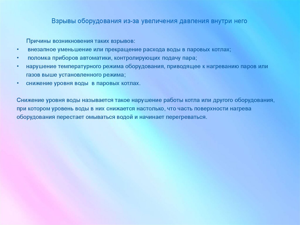 Взрывы оборудования из-за увеличения давпения внутри негоПричины возникновения таких взрывов: