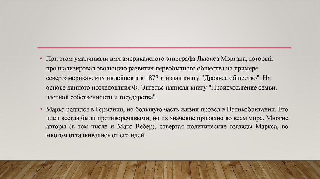 • При этом умалчивали имя американского этнографа Льюиса Моргана, которыйпроанализировал эволюцию развития первобытного общества на примере