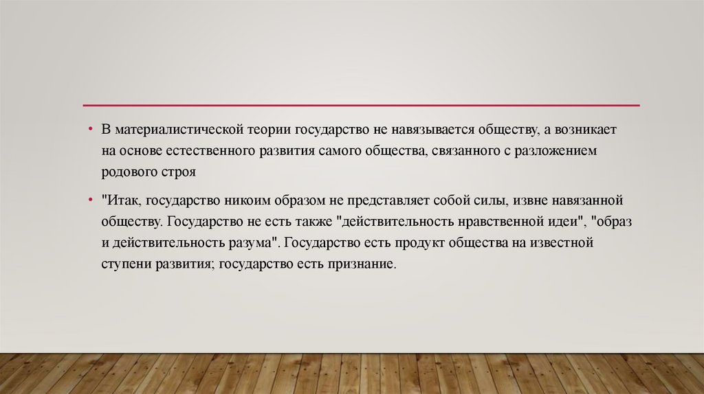 • В материалистической теории государство не навязывается обществу, а возникаетна основе естественного развития самого общества, связанного с разложением